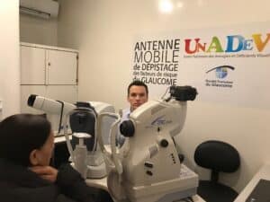 - Le dépistage s’effectue dans le cabinet du Bus du Glaucome en présence d’un ophtalmologiste du CHU local et d’un orthoptiste. La consultation ophtalmologique se déroule de la façon suivante : un questionnaire sur les antécédents familiaux et les éventuelles pathologies oculaires, une mesure de la tension intraoculaire et de l’épaisseur de la cornée (tonopachymètre), un cliché du fond de l’œil sans dilatation (rétinographe) et un champ visuel.