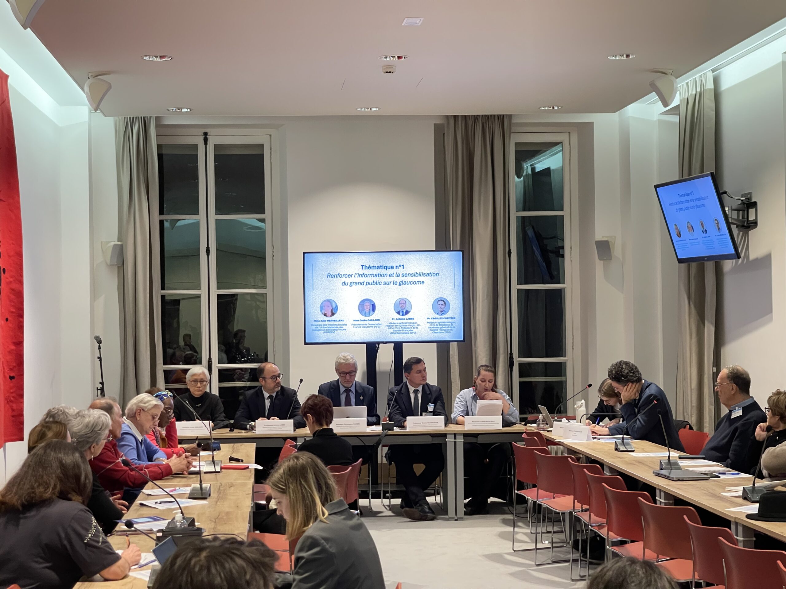 Une table ronde institutionnelle a rassemblé une trentaine de participants – associations de patients, journalistes, professionnels de santé et notre hôte Monsieur le député Christophe Marion. Les thèmes ont été abordés autour du parcours de soins des personnes atteintes de glaucome, du dépistage aux traitements, et la recherche. La Présidente de l’AFG Madame Josée Gaillard a représenté la voix des patients. Elle a évoqué les difficultés qu’ils rencontrent aussi bien dans le dépistage que dans la prise en charge de la maladie. Les débats autour des spécificités du glaucome ont abouti à l’identification de 10 actions concrètes à prioriser en 2026.